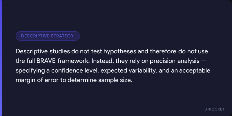 Although BRAVE is the main framework for hypothesis-testing studies, its role changes depending on whether the objective is descriptive, comparative, or predictive.