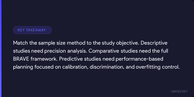 Descriptive studies seek precision. Comparative studies must be BRAVE. Predictive studies require performance-based planning.