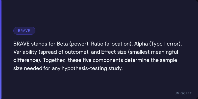 BRAVE represents the five key statistical components used to estimate sample size for studies that compare groups or test hypotheses: