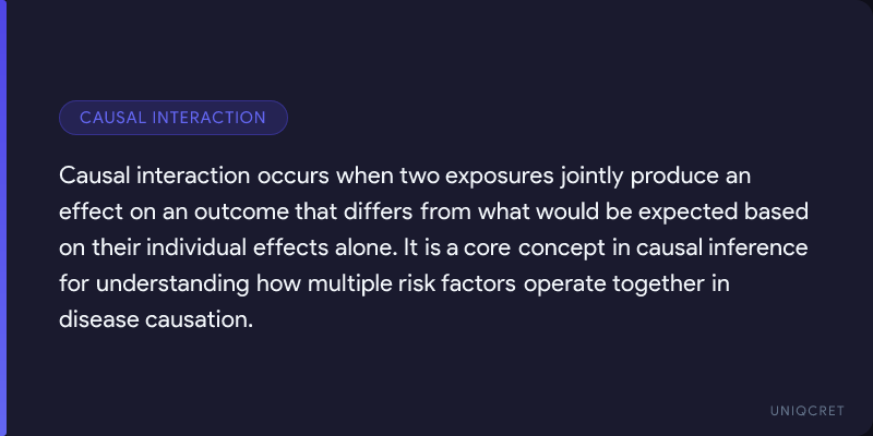 Causal interaction refers to a situation in which two exposures jointly influence an outcome in a way that differs from what would be expected based on their individual effects. This concept is central to causal inference, where the goal is to determine whether observed associations reflect true causal relationships rather than confounding, bias, or chance.