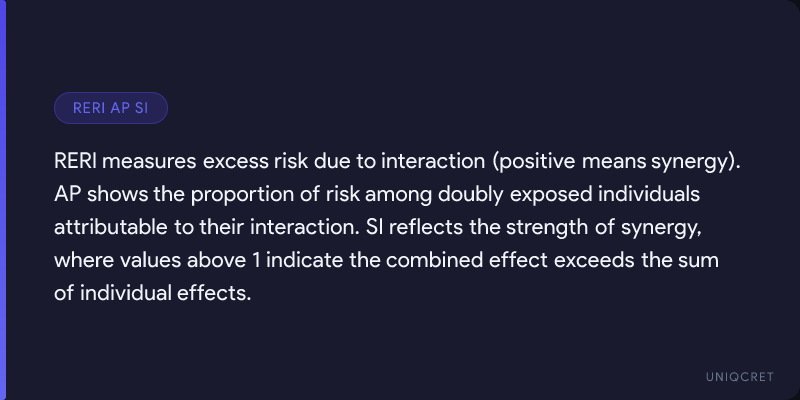 Measures such as RERI, AP, and SI allow researchers to evaluate this excess risk and identify synergistic relationships. However, careful attention to study design and causal assumptions is essential to ensure valid interpretation.