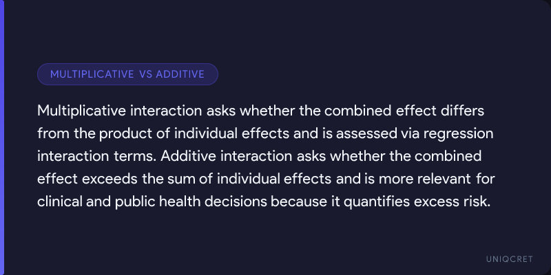 Additive interaction assesses whether the combined effect exceeds the sum of individual effects. This scale is more relevant for clinical and public health decision-making because it quantifies excess risk attributable to the joint exposure.