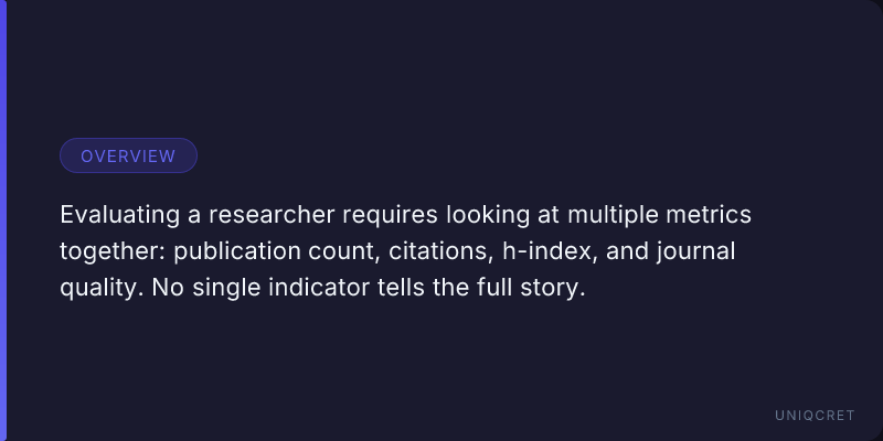 In academic research, evaluating a researcher's work requires more than simply counting the number of publications. A comprehensive assessment should consider multiple indicators, including the number of publications, citation counts, h-index, and the quality of journals in which the research is published.