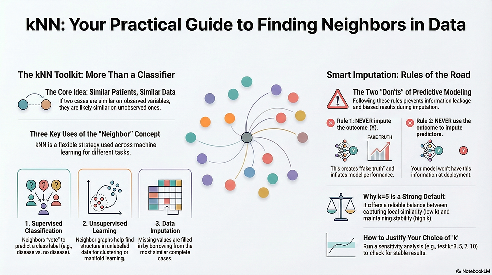 This article explains what kNN is, how it connects to unsupervised learning / clustering, and how to use it safely for missing‑data imputation (including why we do not impute the outcome Y).
